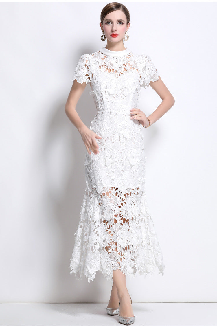 Elevate your summer wardrobe with this elegant short-sleeve midi dress, crafted from waterproof lace fabric. Featuring a refined high neckline and lightweight sheer texture, it delivers both breathability and sophistication. The tailored silhouette blends classic charm with modern elegance, making it ideal for garden parties, brunches, or evening soirées.
