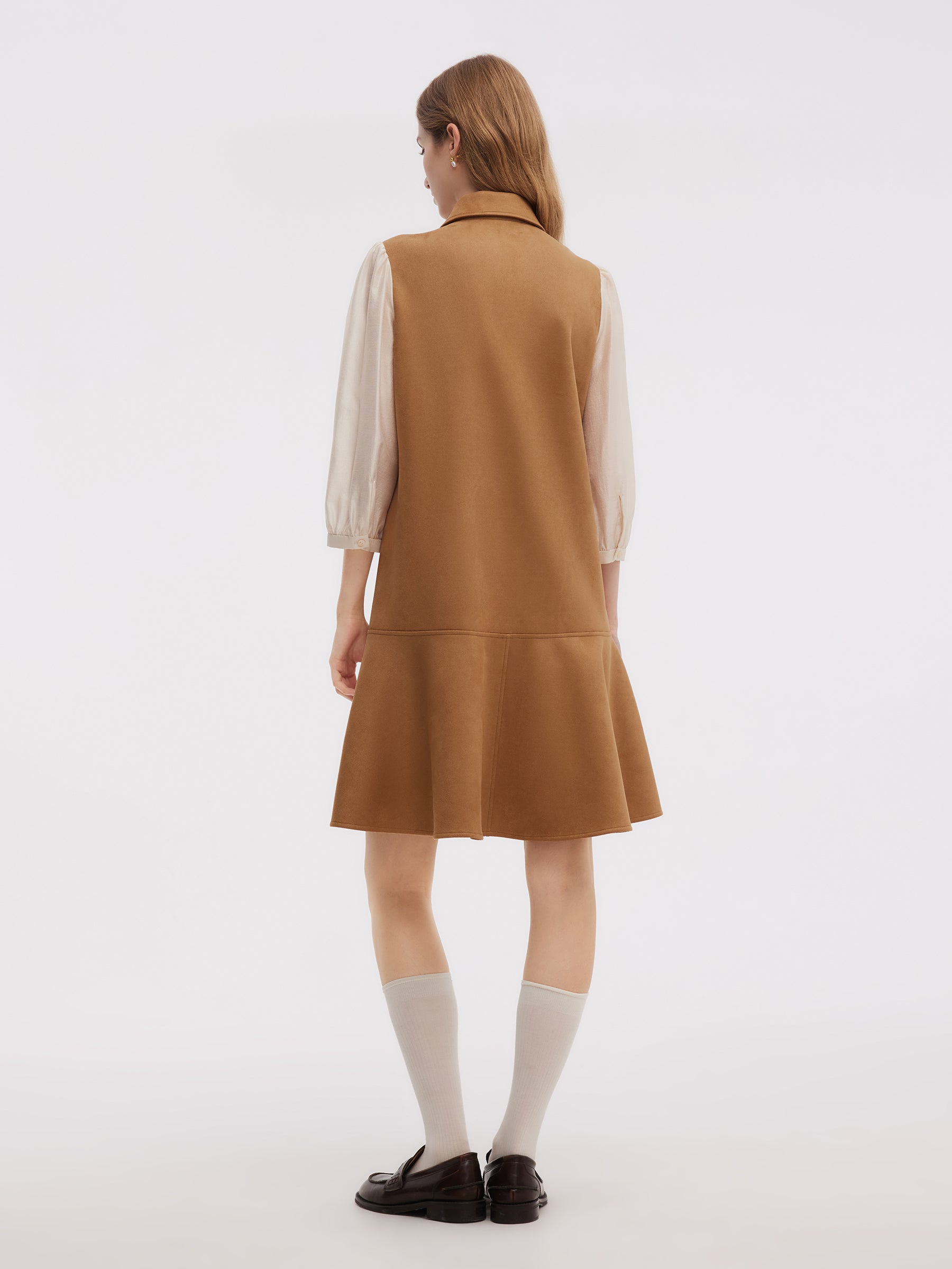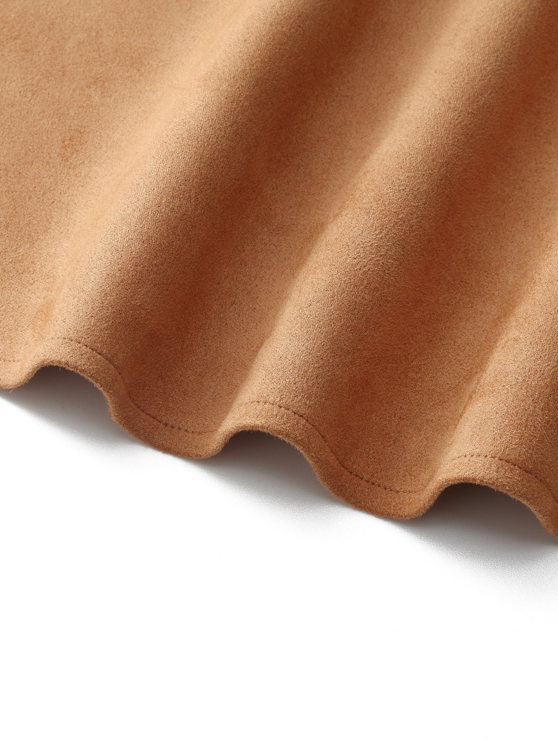 Designed to capture the refined spirit of fall, this brown suede mini dress pairs soft suede textures with delicate lace panels, creating a graceful silhouette that flatters every figure.
