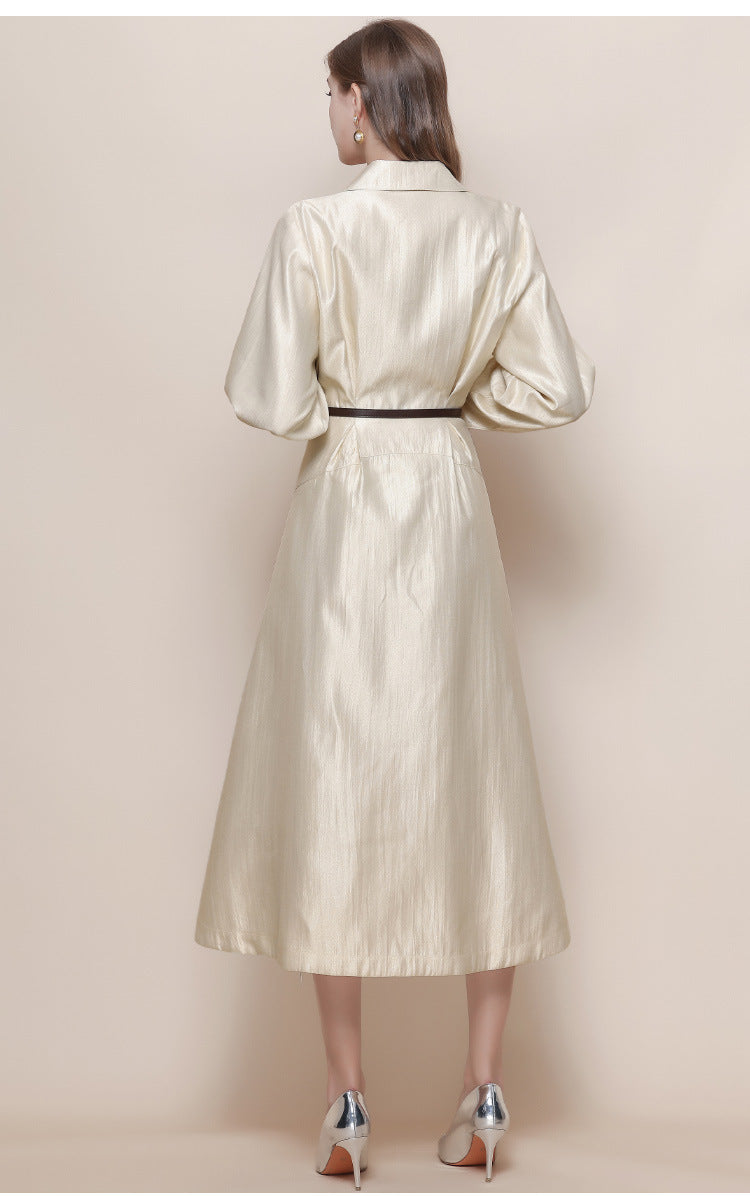 Designed with long sleeves, a classic collar, and button-front closure, this dress embodies understated luxury and effortless confidence.